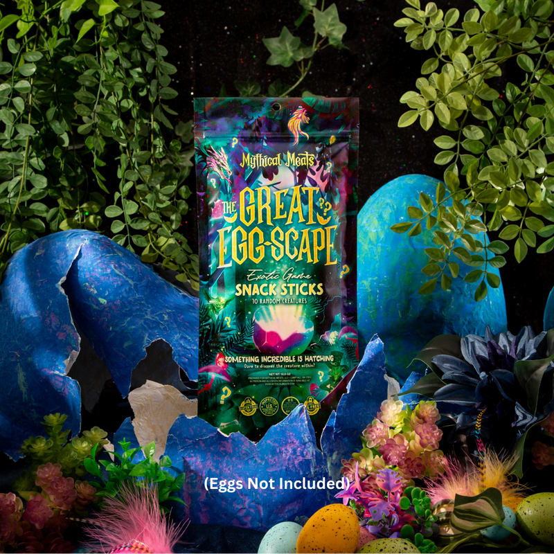 Introducing The Great Egg-Scape by Mythical Meats — a limited-edition Easter variety pack filled with 10 randomly selected exotic game meat snack sticks. Designed in a vibrant, gift-ready bag, this seasonal release makes the perfect candy-free Easter basket upgrade.